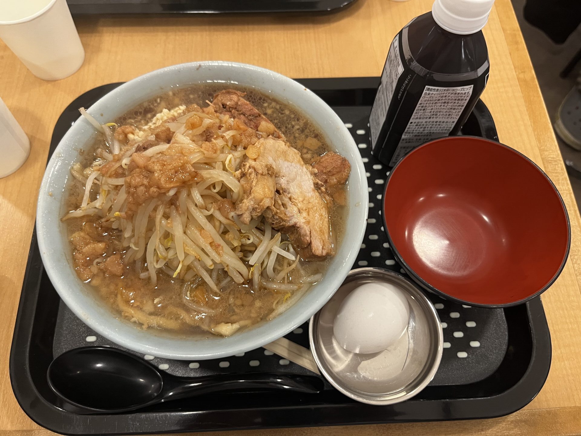 私はラーメン(200g)と生卵と黒烏龍茶を注文しました。ニンニクは少なめそのほかは普通で頼んでいます。